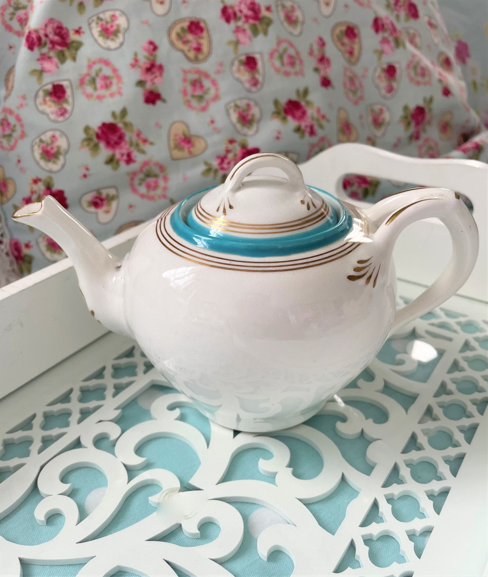 A cute mini Victorian teapot, manufactured in circa 1890, England. . This delightful teapot holds enough for 1 - 2 cups of tea. Lovely rounded body with a bold turquoise hand painted rim. The lid has a delicate raised design enhanced by simple hand painted gold detail, encircled with a turquoise band. The handle is shaped in an angel wing design and both spout and handle are decorated with simple gilded patterns.