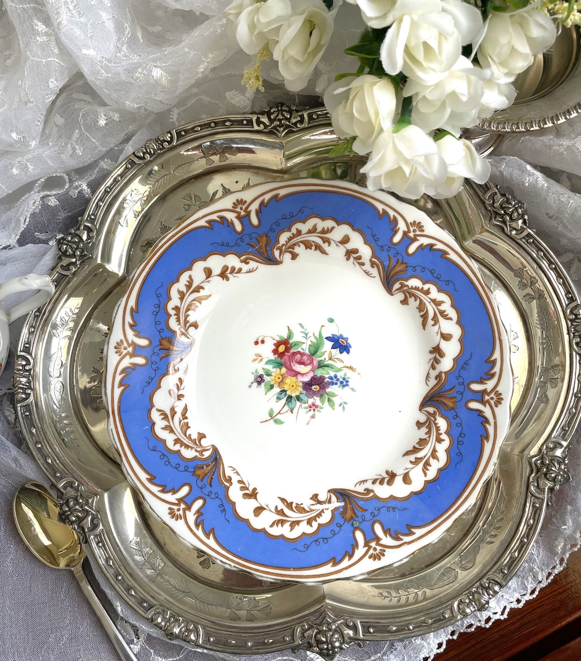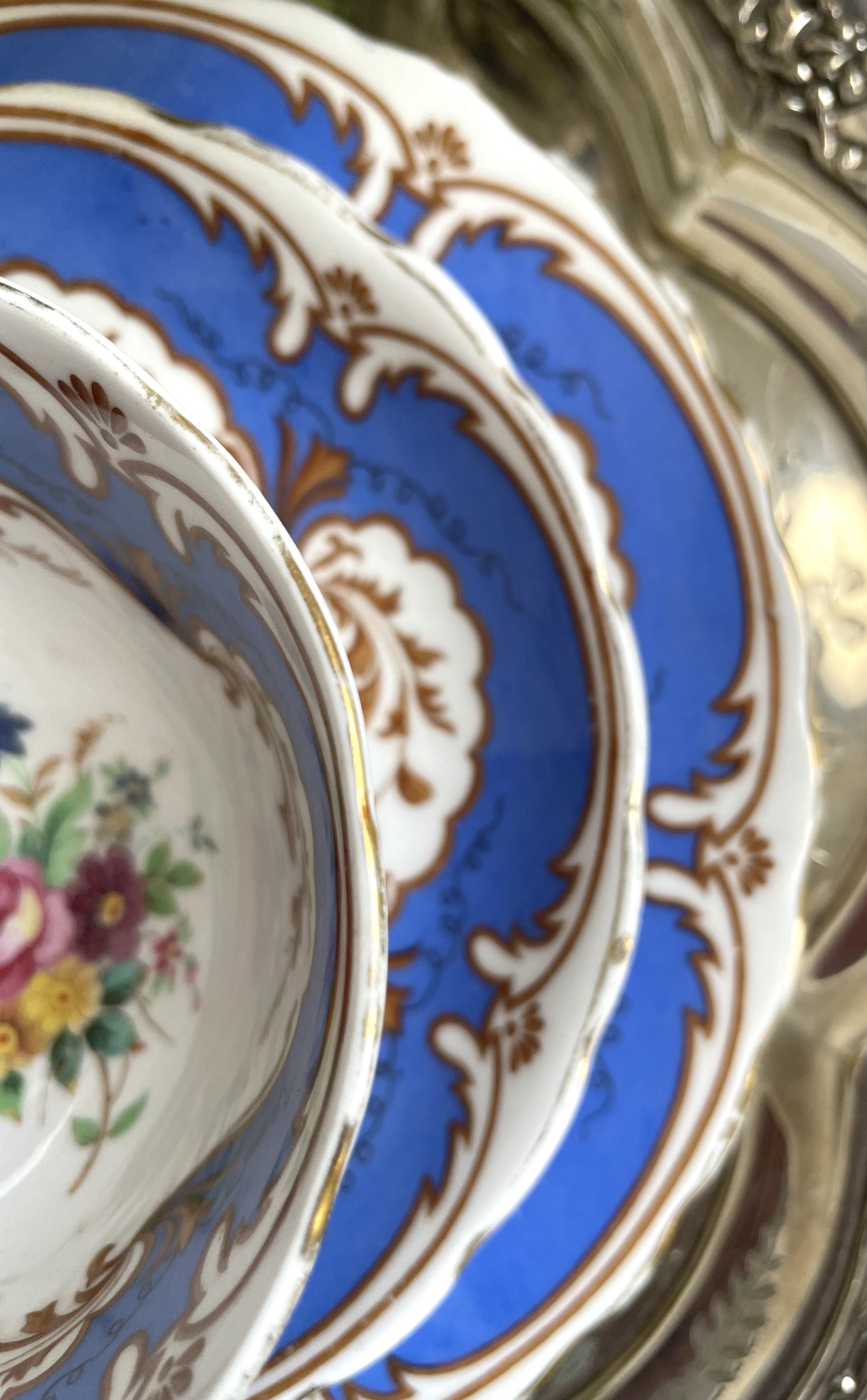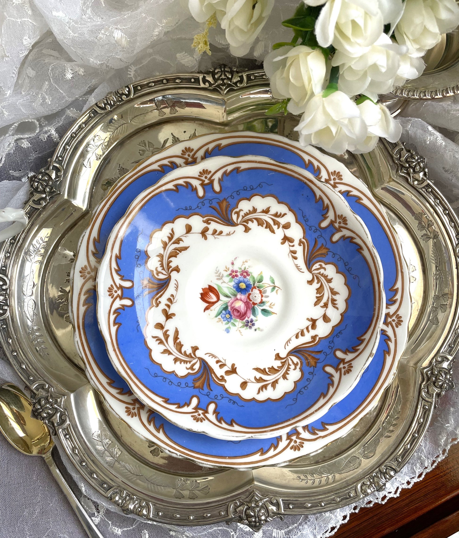 A stunning vintage teacup, saucer and tea plate trio, manufactured in circa 1936, by R.H & S.L. Plant (Ltd), Tuscan Works, England. Decorated with vibrant blue classical patterns and hand painted central floral motifs.