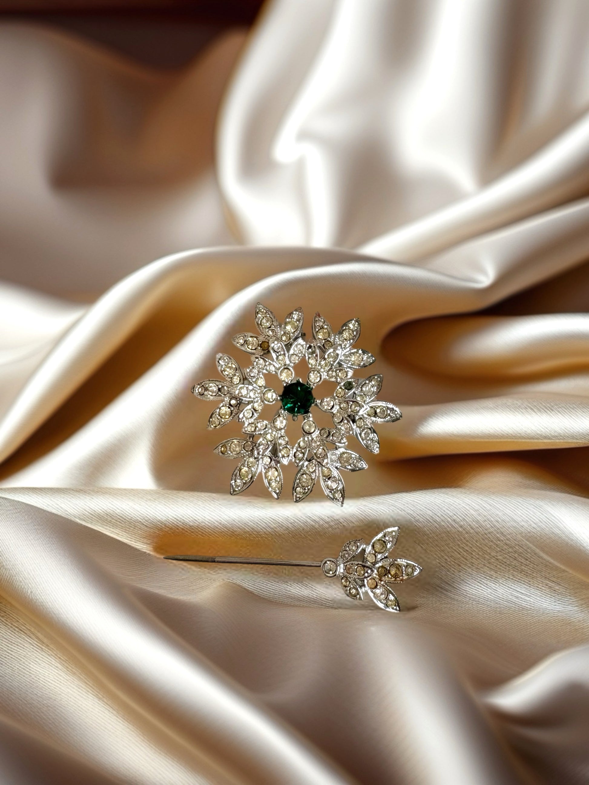 An exquisite vintage Sara Coventry brooch made in the USA. This elegant brooch can be worn three ways, either with the stem pin in or removed. There is also a hook at the back of the brooch making it possible to be attached to a chain. The snow flake shaped brooch is covered in rhinestones with a central bright green crystal set in a silver tone metal. The back of the brooch is intact with a roll over clasp.